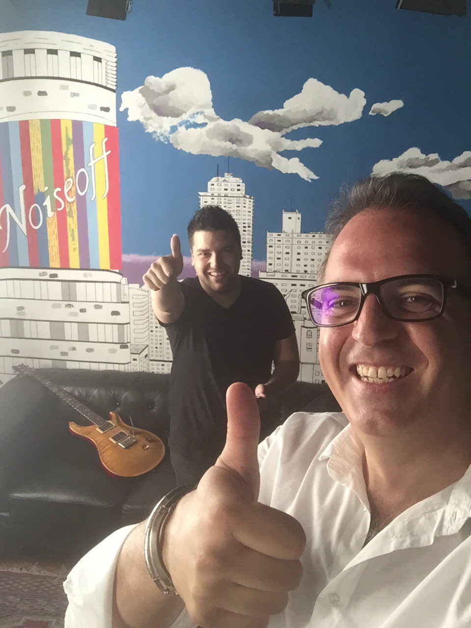 13:00 de la tarde a 40 grados en Madrid, yo con chaqueta americana andando con una guitarra y el rack de efectos, (menos mal que mi manager me acompañaba y me pudo ayudar), dicen que para presumir hay que sufrir, yo desde luego sufrí. Llegamos al Noise Off Festival, lugar en situ en plena Gran Via, entro en sus oficinas y lo primero que me llama la atención son, unos cuadros en el pasillo de todos los artistas que han estado por allí , estaban firmadas y dedicadas, todos esos músicos son muy conocidos y algunos ya veteranos dentro de la música.